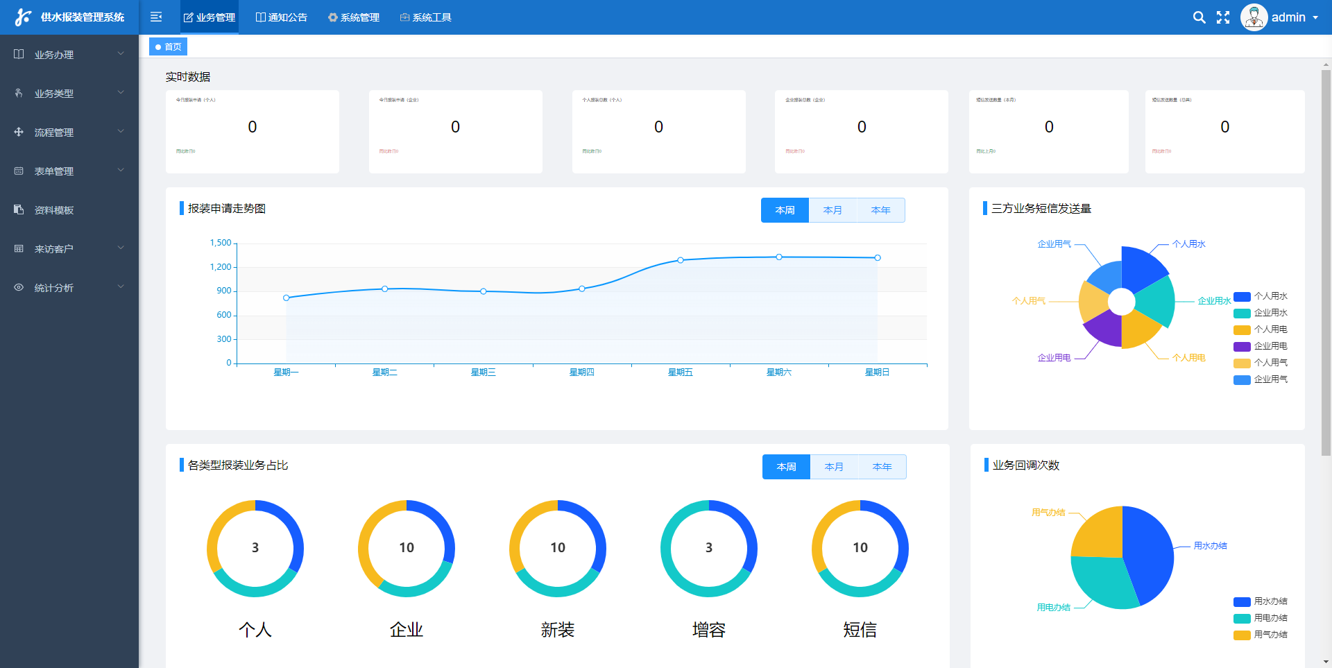 智慧水務報裝管理系統(tǒng)主要包括客戶注冊、問題分類、解決方案、售后服務等環(huán)節(jié)。用戶可以通過該系統(tǒng)在線查詢水務信息、提交報裝申請、支付費用等操作,系統(tǒng)會自動記錄用戶提出的問題和需求,并分配相應的解決方案和服務人員??头藛T可以通過該系統(tǒng)實時跟進用戶的服務需求,并提供相應的售后